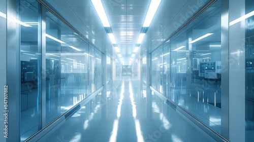 corridor, laboratory, glasses, wall, bright, lighting, sterile, modern, clean, white, blue, floor, ceiling, interior, design, architecture, futuristic, science, research, technology, medicals, hospital, clinic, industrial, space, empty, hallway, shiny, stainless, steel, minimal, simple, geometric, line, pattern, abstract, perspective