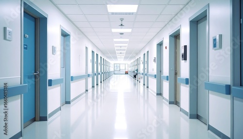 hospital, corridor, hallway, door, sterile, clean, bright, light, medicals, health care, wall, floor, shiny, white, blue, perspective, interior, long, space, building, room, institution