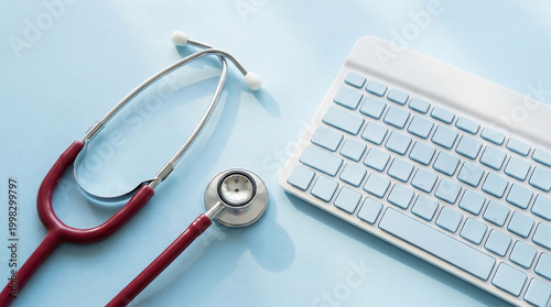 stethoscope, computer keyboard, medical equipment, health care, doctors office, desk, blue background, selective focus, healthcare professional, medicine, closeup, bokeh, blurred background, clinical, hospital, medical office, doctor, nurse, medical supplies