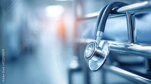 Stethoscope Hanging on Hospital Bed in Blurry Medical Environment