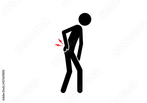 Stick figure experiencing lower back pain with red pain indicators on a white background image view