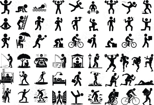 stick, figure, man, icon, set, vector, silhouette, people, human, pose, walk, run, jump, dance, play, simple, black, line, art, minimal, design, symbol, flat, body, shape, action, move, sport, cartoon, draw, vignetting, style, racked, to sit, team, fun, creative, element, abstract, graphic