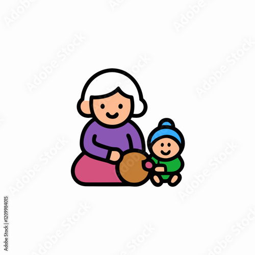 STICKER DESIGN Of A cozy scene of a grandma knitting with a child sitting nearby