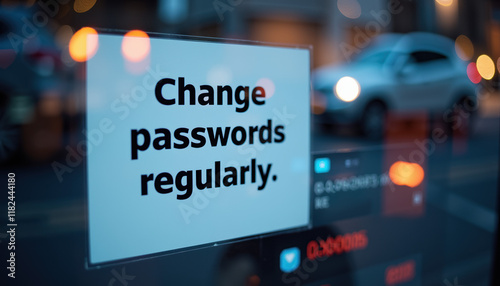Sticker with the text 'Change passwords regularly' displayed in an office setting as a reminder for security.