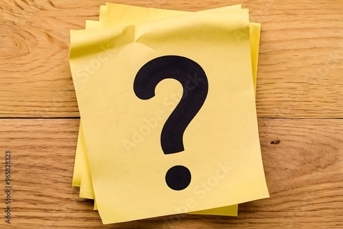 Sticky note with question mark on wooden background. Concept of questions, information, and problem-solving.