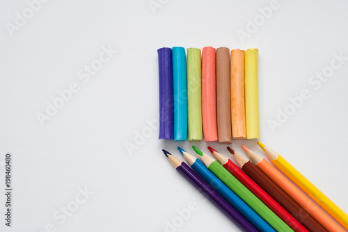 Still life of developing objects for children's creativity and hobbies of adults, colored pencils and crayons, isolated on white background close up