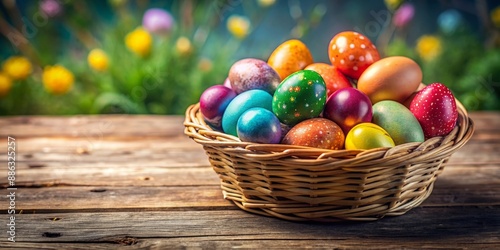 Still life photo of colorful easter eggs arranged in a basket , Easter, eggs, pastel, spring, decoration, holiday
