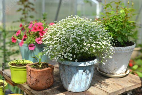 Still life with beautiful seedlings of flowers in pots on the table in greenhouse. Spring and summer botanical and farming background with gardening objects, vintage home garden and retro concept