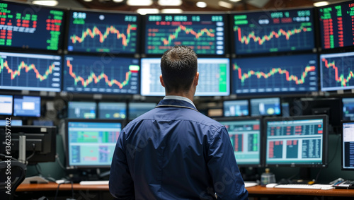 Stock Market Trader Watching Multiple Screens with Graphs and Charts