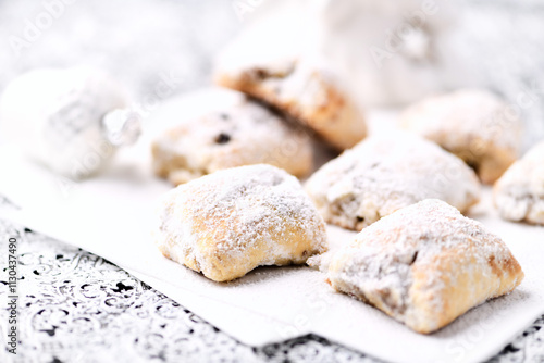 Stollen Bites on bright background. Soft focus. Close up. Copy space.