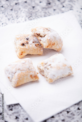 Stollen Bites on bright background. Soft focus. Close up. Copy space.