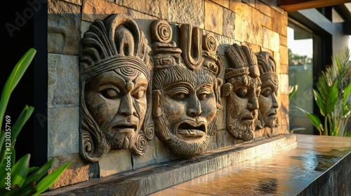 Stone Carvings of Ancient Faces on a Stone Wall