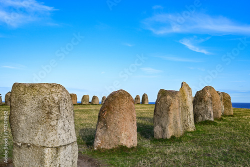 Stone circle Ales stenar in Sweden as one of the largest preserved ship settlements in Scandinavia and tourist attraction, Löderup, Ystad, Skane, Sweden