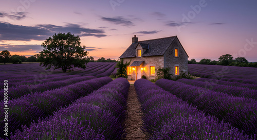bungalow, lavandula, field, sunset, purple, stone, countryside, rural, serenity, calmness, peaceful, calm, evening, twilight, photo, image, picture, scenic, beautiful, nature, landscape, art, artwork, print, photo, home, house, real estate, property, floral, flower, romantic, idylli, charming, aesthetic, vibrant, view, scene, marketing, advertising, commercial, sale