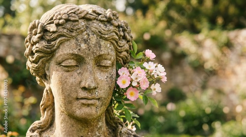 Stone statue of a woman with closed eyes decorated with pink flowers in a garden. Antique bust representing peace and beauty. Spiritual art for cemetery memorial or religious decor.