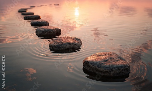 Stones stepping across still water at dawn. Sun reflects on ripples