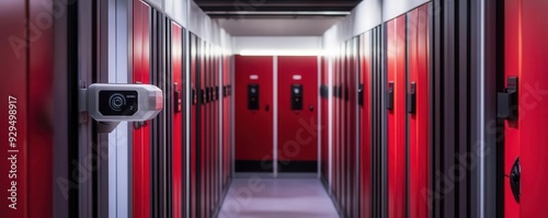 Storage room with CCTV cameras and secure lockers front view safe storage robotic tone Tetradic color scheme