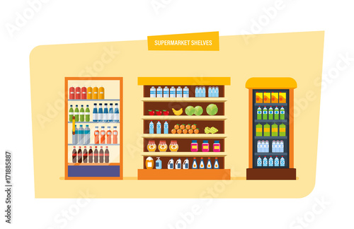 supermarket, shelf, concept, grocery, store, drink, vegetable, fruit, buying, vector, illustration, isolated, white, background, interior, room, rack, juice, shelf, shop, assortment, bag, bottle, box, business, buy, confiture, eating, eco, equipment, farm, flat, food, fresh, honey, icon, indoor, info, market, marketing, packing, preserving, retail, showcase, signs, racked