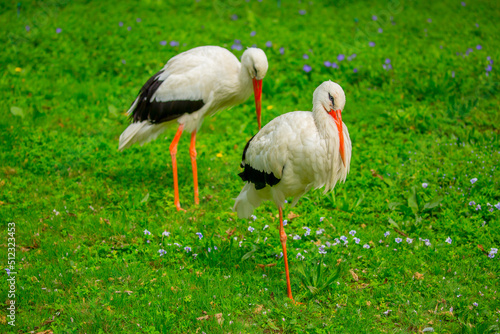 Stork Bird walks through the green thickets of plants. Concept of newborn pregnancy and childbirth with space for text. White stork close up.