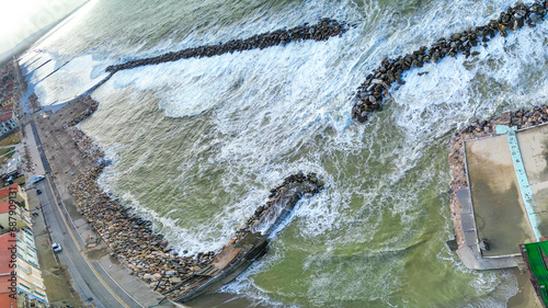 Storm in Marina di Pisa, Tuscany. Fury of the waves on the coast, aerial view on a sunny morning