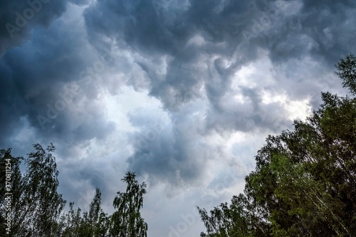 Stormy black clouds in the sky before a storm, thunderstorm and rain with a strong wind. Russia.