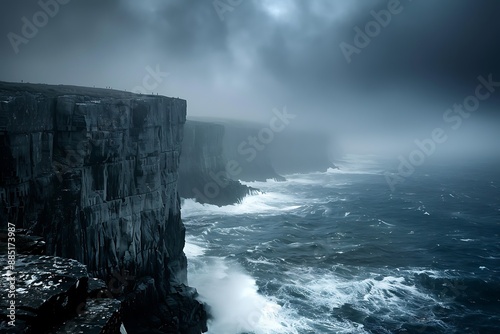 cliff, ocean, storm, wave, sea, coastline, rock, rocky, water, dramatic, nature, landscape, seascape, weather, turbulent, fog, mist, grey, blue, dark, powerful, wild, wind, crashing, rough, horizon, sky, photo, natural, wildness, force, gloomy, whirlwind, turbulence, intensity, unpredictable