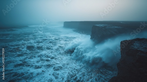 storm, ocean, wave, crashing, cliff, rock, coast, sea, powerful, wild, nature, dramatic, mist, fog, blue, grey, violent, turbulent, impetuous, forceful, elemental, power, destructive, mighty, rough, foam, spray, force, dangerous, treacherous, rocky, landscape, element, beauty