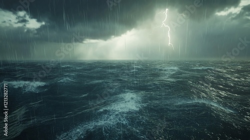 Stormy ocean, lightning strike, rain, waves, dramatic sky, nautical background, game asset