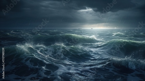 stormy, sea, night, wave, rain, dark, cloud, ocean, tempest, rough, water, turbulent, wind, foam, spray, lightning, horizon, ship, distant, illuminated, dramatic, powerful, nature, landscape, texture, detailed, realistic, digital, art, illustration, wide, photorealistic, dark blue, grey, green, white, view, element, force, epic, intense, threatening, wild, dangerous, huge