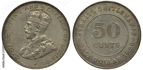Straits Settlements silver coin 50 fifty cents 1920, bust of King George VI in ceremonial attire left, denomination within circle of beads,
