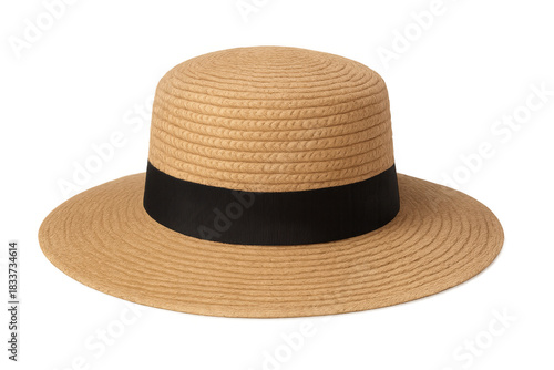 Straw boater hat with black ribbon, fashion accessory for summer, sun protection, isolated with transparent background