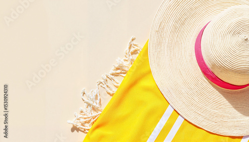hat, straw, beach, towel, yellow, summer, relaxation, vacation, casual attire, accessory, lifestyle, sunny, texture, light, fabric, cosy, sunlight, detail, fashion, travel, leisure, warm, comfort, sunhat, trendy, bright, horizontal, closeup, warmth, vibrant, soft, tropical, pattern, decorative, holiday, picnic, nature, natural, fun, enjoyment, simplicity