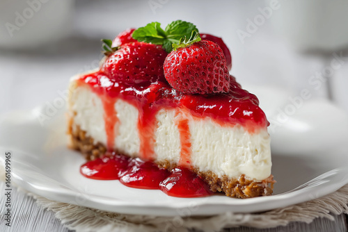 pastry, wedding, cream, beautiful, delicious, cheesecake, strawberry, dessert, slice, sweet, fruit, topping, sauce, plate, food, epicure, homemade, baking, rich, creamy, decadent, indulgent, fresh, berry, red, white, closeup, rustic, texture, cake, bakery, cafes, eatery, presentation, styling, celebration, party, birthday, anniversary, holiday, festive, special, occasion, treat, snack, healthy, organic, garnish, mint