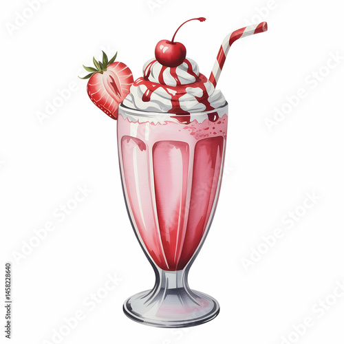 Strawberry Milkshake Delight Water Color: An irresistible strawberry milkshake with a creamy whipped topping, a juicy strawberry garnish, and a red-and-white striped straw.