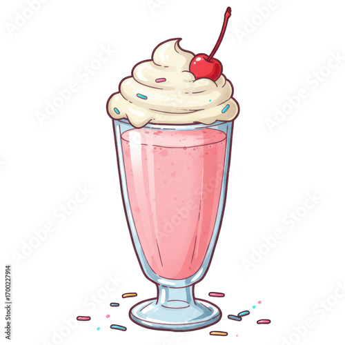 milkshake, strawberry, cream, whipped, whipped cream, cherry, dessert, sweet, food, drink, beverage, glasses, sprinkle, refreshment, delicious, tasty, deliciously, treat, indulgence, dairy, cold, glacé, pink, red, cartoon, drawing, illustration, icon, vector, clip art, graphic, retro, vintage, dinner