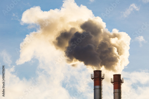 Stream of dark smoke from the chimney of factory in the industrial district