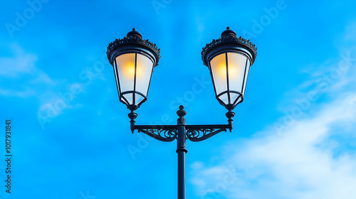 street light, lamp-post, lamp, lighting, street light, street light, street lighting, urban, city, town, city landscape, sky, blue skies, cloud, white cloud, day, daytime, summer, sunny, bright, overhead, perspective, angle, black, metal, iron, vintage, traditional, classic, elegant, ornate, decorative, design, architecture, public, city life, modern, city landscape, street scene