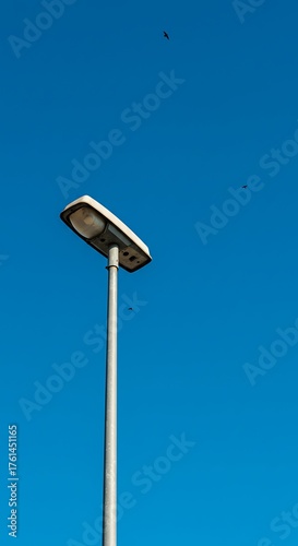 street light, sky, blue, urban, minimalist, pole, light, daylight, structure, modern, simple, clean, bright, clear, contrast, vertical, tall, isolated, alone, environment, infrastructure, design, shape, form, composition, angle, perspective, view, sharpened, detail, texture, surface, material, metal, concrete, construction, engineering, technology, energy, power, illumination, shadow, sunlight, weather, atmosphere, space, background, colours