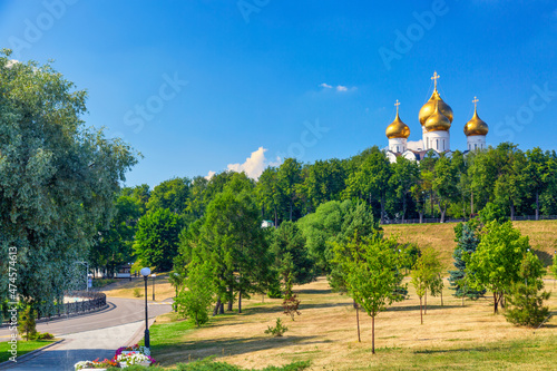 Strelka park and Assumption Cathedral in summer. Yaroslavl city, touristic Golden Ring in Russia.