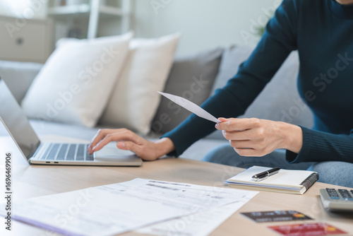 Stressed asian young business woman, employee using laptop computer to calculate expenses, hand holding bills and receipt for to payment on table at home. Financial, finance of banking concept.