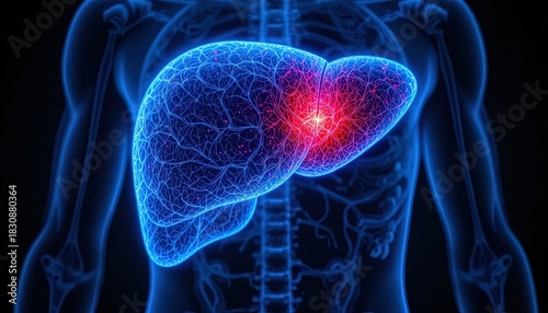 Striking medical visualization of liver inflammation, showing human anatomy, ideal for health, wellness, and pharmaceutical marketing campaigns