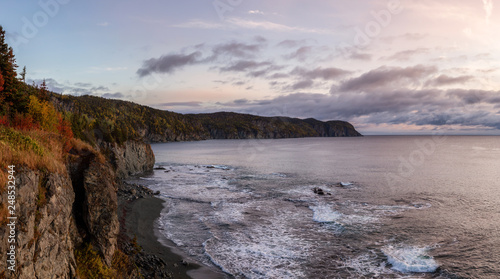 Striking panoramic landscape view of a rocky Atlantic Ocean Coast during a vibrant sunrise. Taken at Beachside, Newfoundland and Labrador, Canada.
