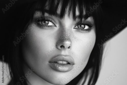 portrait, woman, eye, lip, dark hair, hat, closeup, beauty, fashion, make-up, expression, model, stunning, feature, elegance, style, gaze, chic, character, head shot, confident, youthful, trendy, emotional, sophisticated, monochrome, allure, charme, personality, delicate, capturing, attracted, sharpened, detailed, striking, vibrant