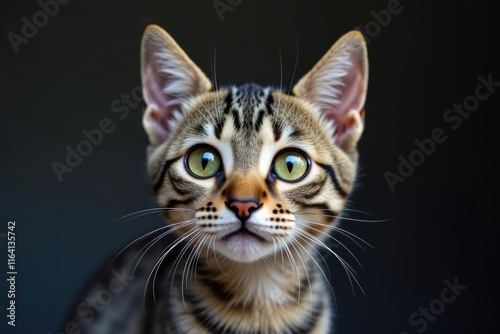 cat, felino, kitten, pet, animal, mammal, short hair, american, tabby, cute, adorable, eye, green, portrait, face, head, whisker, fur, striped, domestic, breed, purebred, pedigree, closeup, detailed, studio, dark, background, isolated, young, curious, focused, looking, innocent, beautiful, lovely, nature, fauna, wildlife, closeup