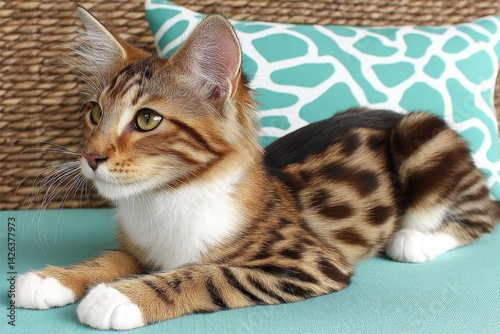 Striking spotted cat rests gracefully on a colorful cushion in a cozy indoor setting on a sunny day