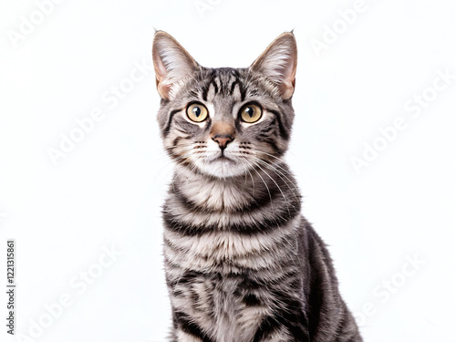 Striped cat with bright eyes poses against a light background showcasing its expressive personality and playful demeanor