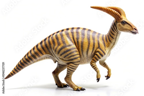 Striped Parasaurolophus dinosaur on white background