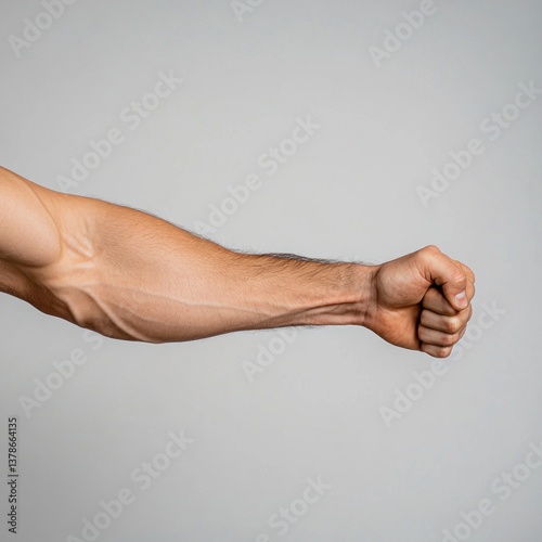Strong Male Arm with Defined Muscles Flexing Against Neutral Background