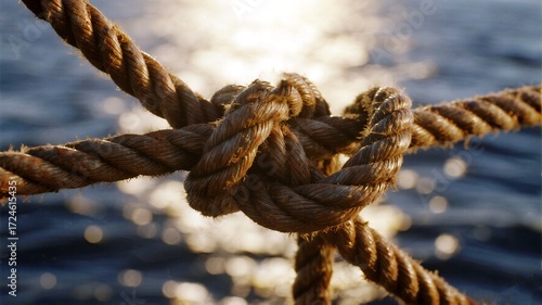 Strong nautical rope tied in a knot shines in sunlight creating a sense of durability and connection, perfect for themes of resilience, commitment, and maritime adventure
