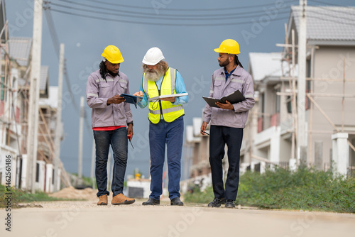 Structural engineer and worker working with blueprints discuss at the construction site. Engineers on building site. Two worker or labor and one engineer are reviewing the project. Architecture.